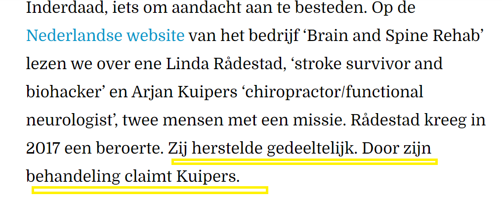 "Het bedrijf Brain and Spine Rehab van chiropractor Arjan Kuipers kwakzalft bij hersenschade na beroerte of hersenschudding"