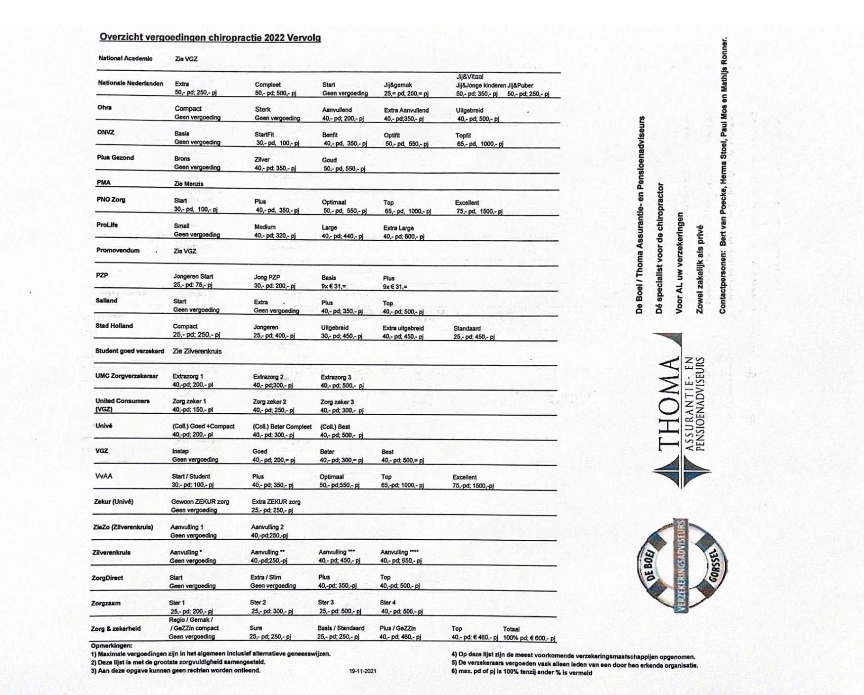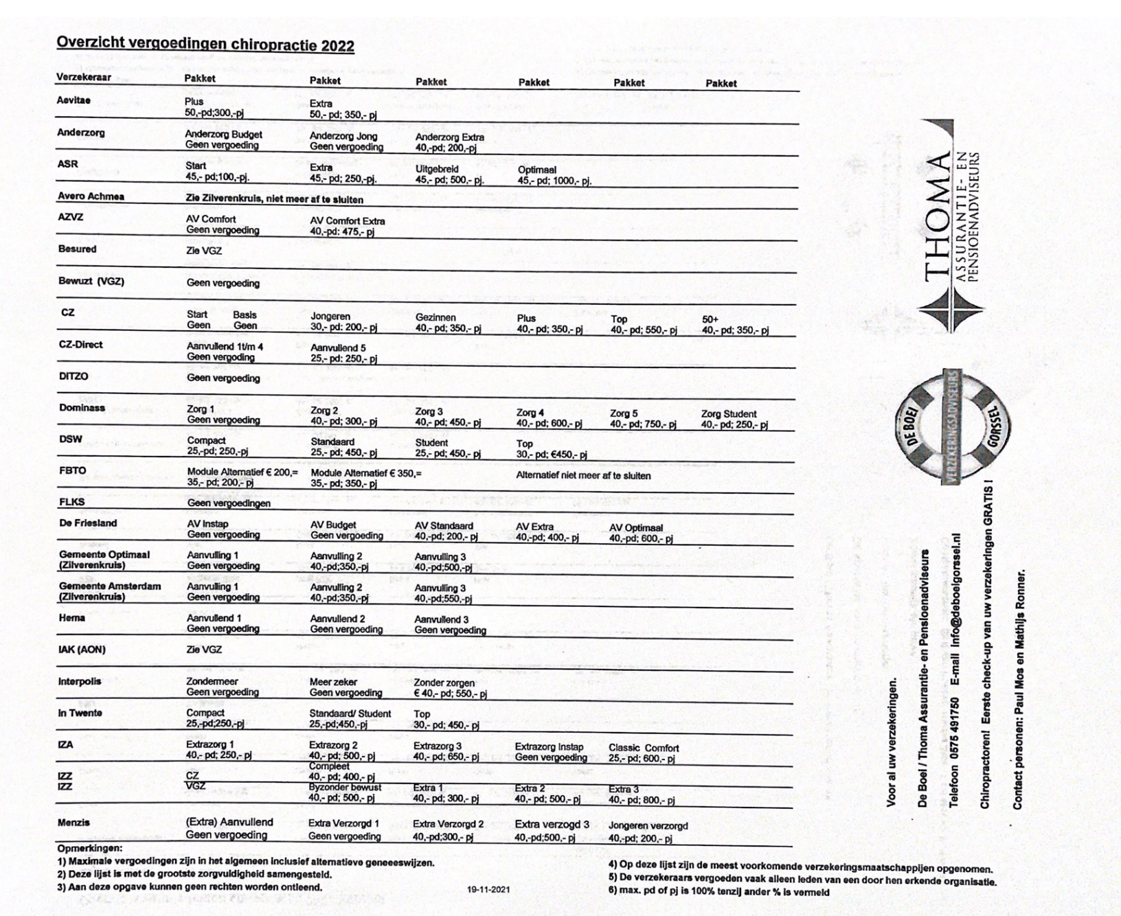Overzicht vergoedingen chiropractie 2022
